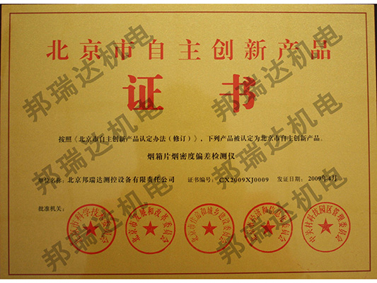 我公司研發(fā)的“煙箱片煙密度偏差檢測儀”獲得了北京市自主創(chuàng)新產(chǎn)品證書
